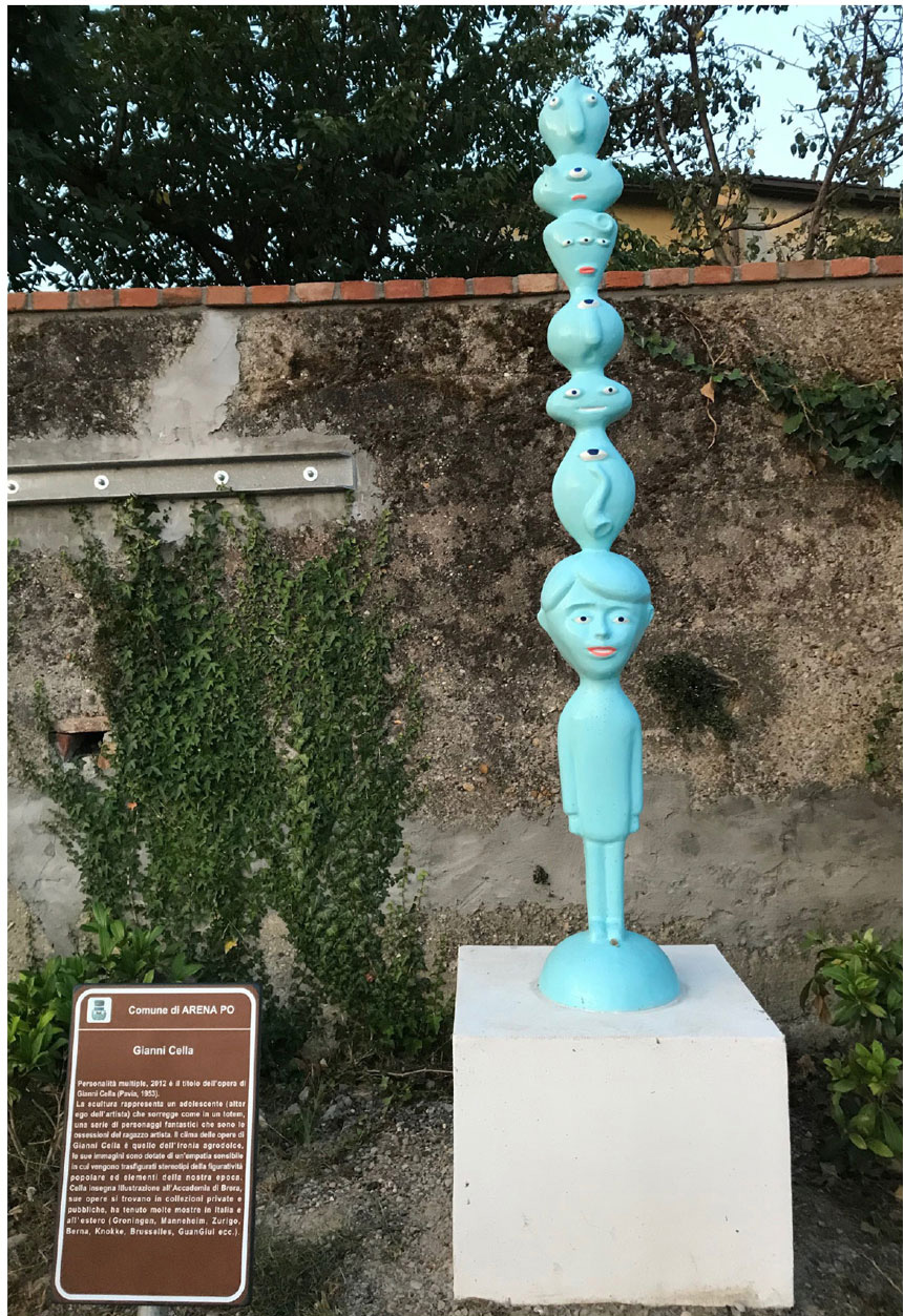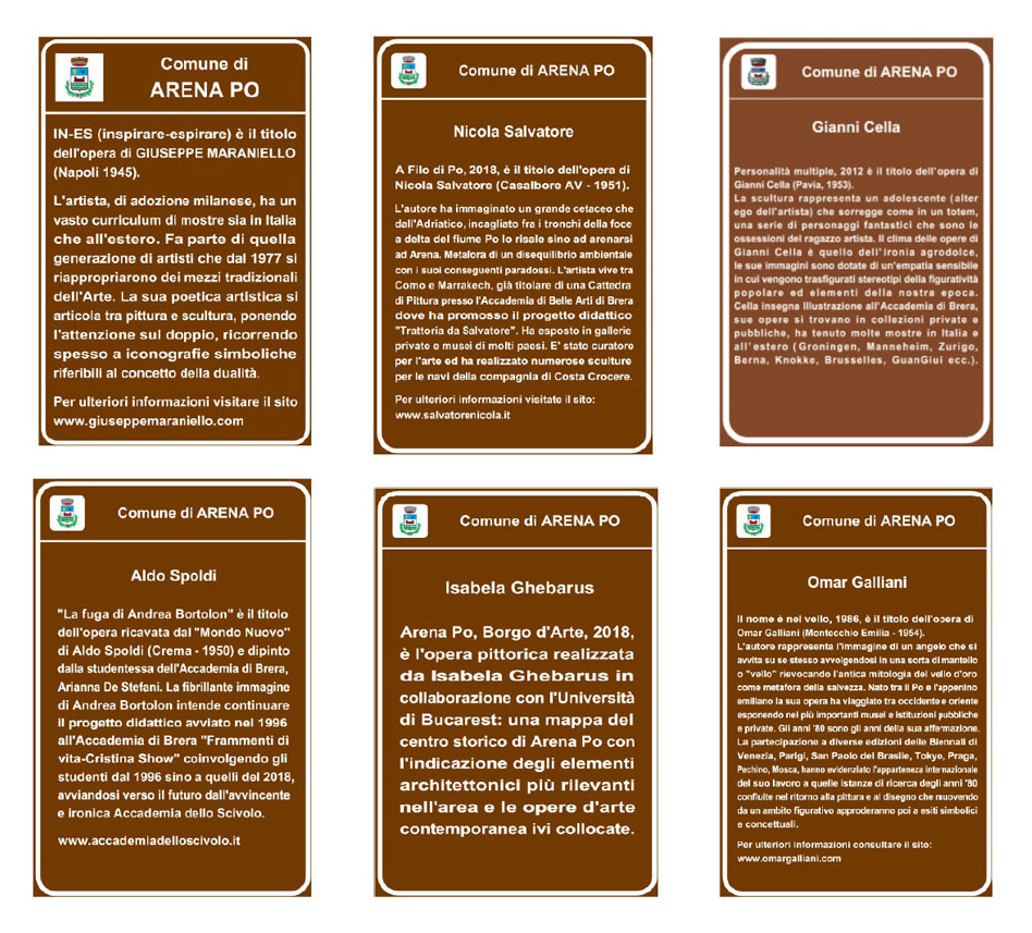 Piano piano aumentano le opere ad Arena Po e ognuna di esse viene accompagnata da una illuminazione notturna ed una targa con l’esplicazione essenziale dell’opera e delle informazioni sull’autore in modo che i fruitori abbiano un minimo di strumenti per capire.