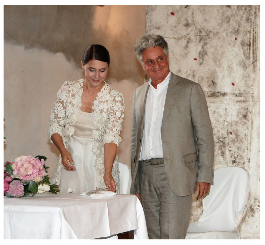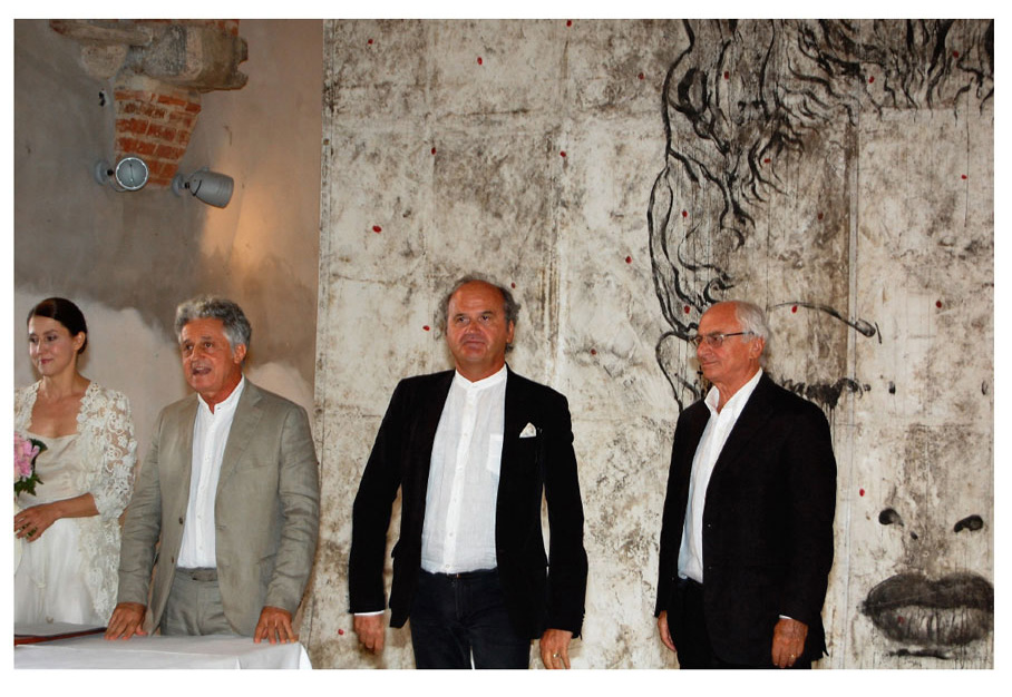Al nostro matrimonio annunciamo la nascita della nostra Associazione e ospitiamo fuori del castello la grande scultura di Giuseppe Maraniello e dentro il castello un grande dipinto di Omar Galliani che fa da sfondo a questa foto.
